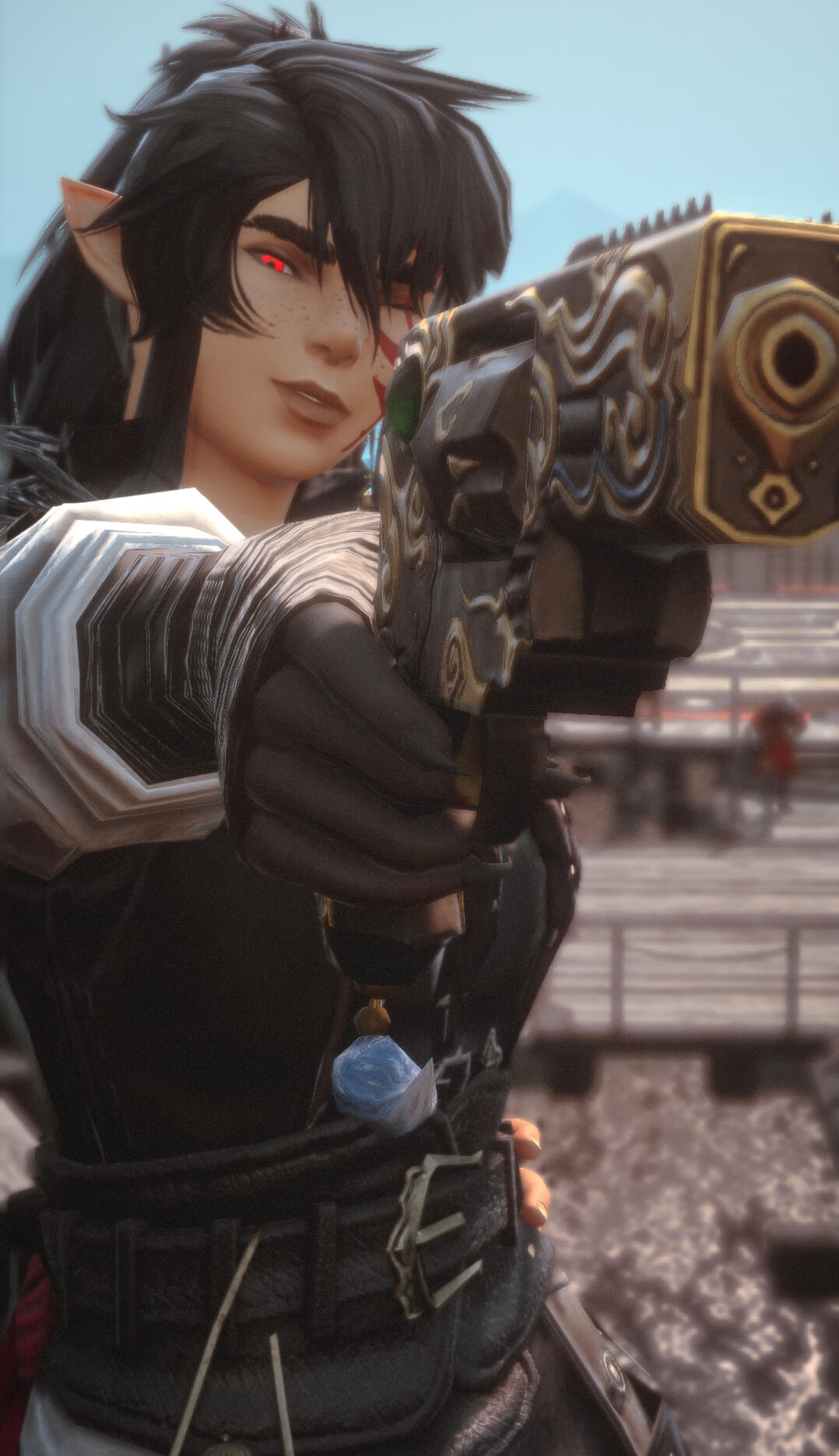 Moonfall brought change to Eorzea, and even further beyond its borders. The landscape ravaged by the dread primal, the sky alit with flame far to the west. As the clouds burned, an iridescent-haired stranger washed up on the shore of Gangos. Body battered and spirit crushed, she had only one request of the Resistance members who found her. With blades held ready to carry out her sentence, she had one request before her consciousness expired.”You’re right to be angry.” Every threat. Every insult. Every doubt.Her voice cut above even the sound of enemy fire. Her orders never failed. Her truth never faltered.